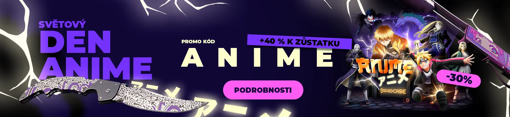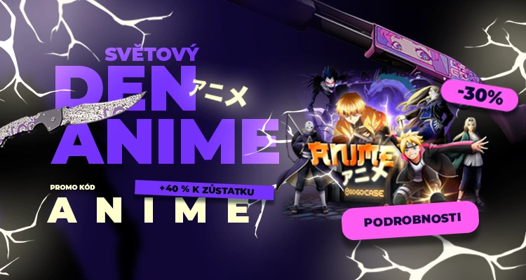 Světový den animeOslavme to společně!Aktivuj promo kód ANIME a získej +40 % k vkladu pro otevření ještě více beden.Tematická anime bedna se slevou -30 % už na tebe čeká! Uvnitř najdete jen zářivé a vzácné skiny!