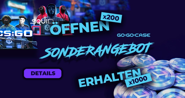 Öffnen Sie 200 beliebige Boxen auf GO:GO:CASE und Sie erhalten garantiert 1000 GO:Coins auf Ihr Guthaben gutgeschrieben.